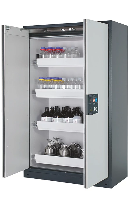 · 4 x tálcás polc, teherbírás: 60 kg, űrtartalom: 29 liter, porszórt acéllemez, RAL 7035 világosszürke